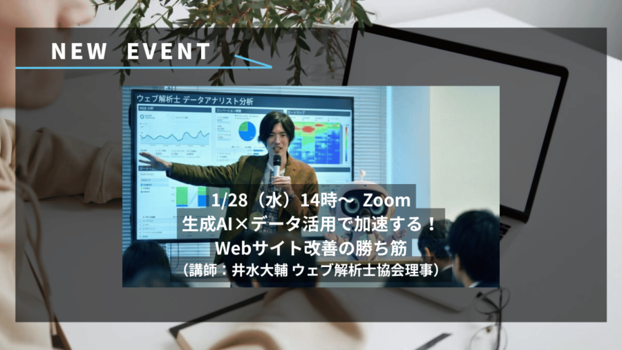 1/28(水) 14:00-15:30にて「生成AI×データ活用で加速する!Webサイト改善の勝ち筋(講師:井水大輔 ウェブ解析士協会理事)」がZoomにて開催されます。生成AI(ChatGPT/Gemini)でWebサイト改善の最新手法を学ぶ出版記念講義です。ぜひご参加ください。