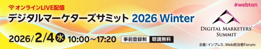 本イベントは、Web担当者Forum主催の大型オンラインイベント「デジタルマーケターズサミット 2026 Winter」が、2026年2月4日(水)に開催されます。DMM.com、花王、パナソニックコネクト、三菱電機なども登壇し、全17講演を無料で視聴可能な1日イベントです。