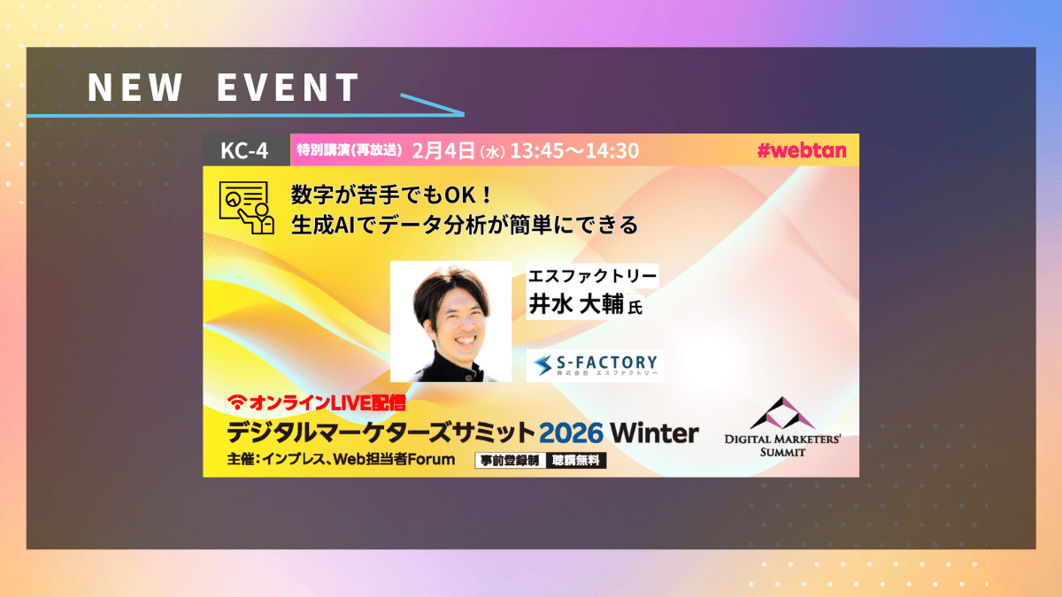 【2/4(水)開催】井水大輔氏 登壇!『数字が苦手でもOK!生成AIでデータ分析が簡単にできる(デジタルマーケターズサミット 2026 Winter)』