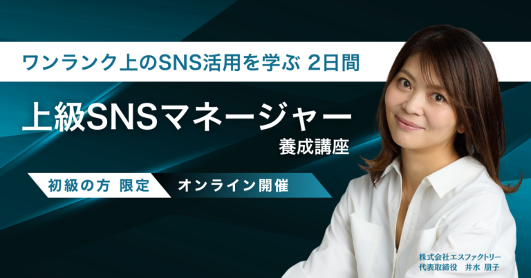 上級SNSマネージャーとは SNSマネージャーとは、一般社団法人ウェブ解析解析士協会内で開催されていたソーシャルマネジメント研究会で行われていたコンサルタント同士の勉強会を体系化してできた認定講座で、初級マネージャー・上級SNSマネージャー・チーフSNSマネージャーの3つの資格レベルがあります。 初級SNSマネージャーとは SNSを導入したい / 新たなSNSをビジネスに取り入れたい / 新しく加 … 続きを読む 上級SNSマネージャー養成講座(講師:井水朋子)